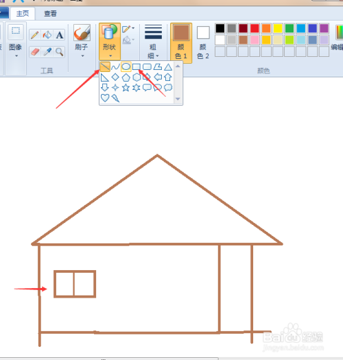 小木屋结构,工具栏-形状-直线-小粗线-褐色;在左边的位置利用直线往外延伸,右边画一条垂直线即可;如下图