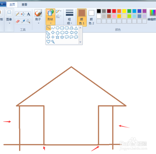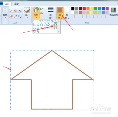 小木屋定型,工具栏-形状-向上方向标-小粗线-褐色;画图区域 画出方向标,如下图