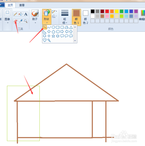 小木屋小细节,橡皮擦,擦除刚刚画出来的线条;直线褐色,在屋子上面根直线形成三角形。如图下