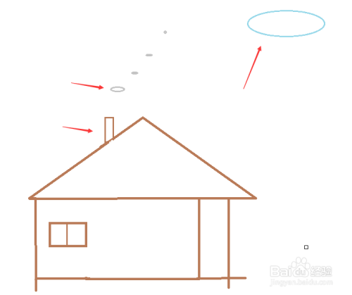 小木屋烟筒、屋子上方的云朵。形状圆形、正方形-颜色蓝色、灰色、褐色。烟筒用正方形褐色 在房子左上方画个长形状;烟筒上方 烟 圆形+灰色;云朵蓝色+圆形 右上方;如下图