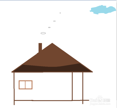 小木屋上色,油漆桶、褐色、蓝色;(颜色可以自己调配)主要是小木屋顶上色 褐色,云朵是蓝色 云朵需要用橡皮擦 擦出不规则的边边来,如下图 完成