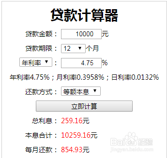 4、比如,借款1万元,借款期限12个月,输入年利率4.75%,还款方式为等额本息。得到计算结果如下图所示,就可以得到年利率为4.75%的本息总额是多少,进一步还可以看到每月利息等计算结果。