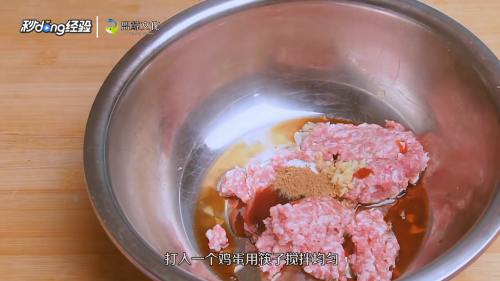 4将猪肉剁成肉泥放入盆中,加入一勺姜末、一勺生抽、一勺油、一勺耗油、一勺五香粉、打入一个鸡蛋用筷子搅拌均匀。