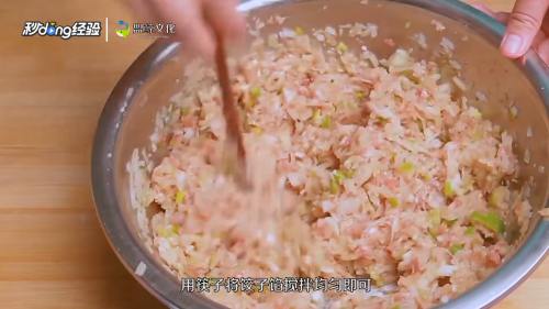 6将萝卜馅用纱布滤出水分放入肉馅里,用筷子将饺子馅搅拌均匀即可。
