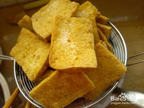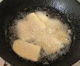 注意炸制过程中用竹筷翻动,等待豆腐两家均呈金黄色,捞出沥油。