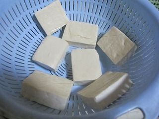 等待油烧至七层熟时,把沥干水的豆腐放入油锅中干炸制。