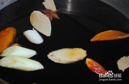 在原锅中留适量的余油起火,加入适量的卤汁,逐步放入盐、糖、料酒、葱、姜、酱油、香料翻炒一下,加入适量的鲜汤。