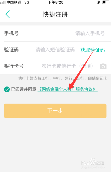 进入注册页面后,完善你的信息,如下图所示包含手机号、银行卡等。完成后点击页面下方的下一步。