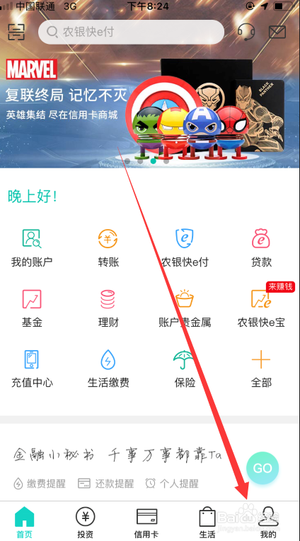 首先我们需要打开手机中的农业银行,如下图所示,进入首页点击我的入口。
