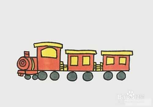 44、最后给画好的火车形状涂上颜色,车身涂上红色,车顶涂上黄色,车轮涂上黑色,一辆简单的火车就画出来了。END