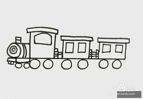 33、然后画出第二个车厢,两个车厢的大小形状一样,然后在横线下画出六个车轮,这样一辆火车的形状就画出来。