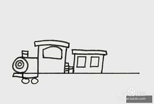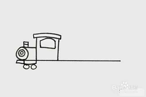 11、首先画出圆圆的车灯,往下画出底座,往后画出车头和驾驶室,在驾驶室下画出窗户后再画出一条长长的横线。