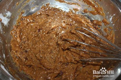 然后将食用油、蛋黄和枣泥放入一个盆中搅匀,然后筛入面粉翻拌均匀。