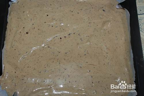 在烤盘中铺上油纸,将做好的蛋糕糊放入烤盘中,震一下烤盘(为了把蛋糕糊中的气泡震出来)。