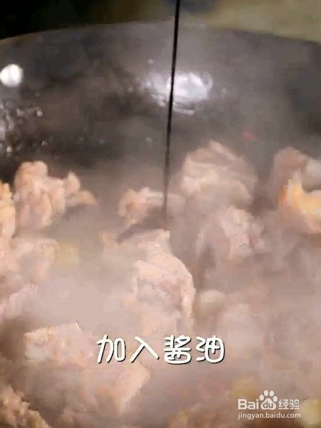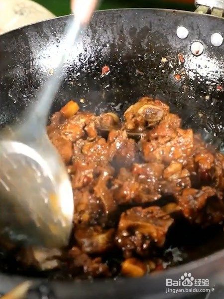 放入排骨翻炒,加入料酒,生抽,蚝油,酱油翻炒均匀。