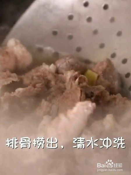 排骨冷水下锅焯水,放入姜片,料酒,葱,盖上煮熟,切葱花,小米椒,姜块,排骨捞出,清水冲洗。