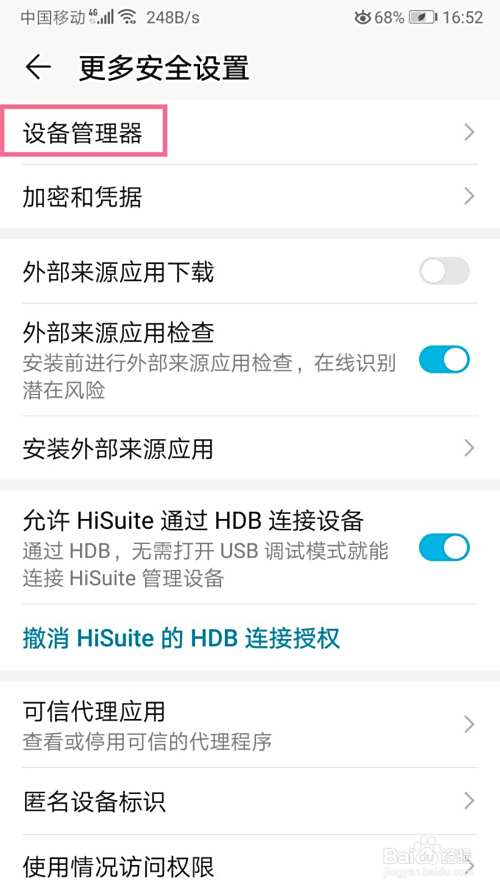 随后进入更多安全设置的页面点击【设备管理器】选项