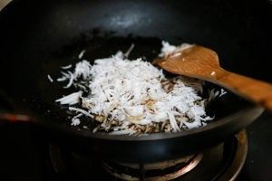 取出糯米皮,放上椰丝,撒上花生碎和白芝麻,卷起来;