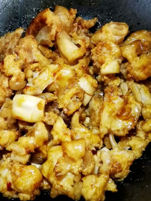 4锅里热油,放入冰糖炒出糖色,放入姜片蒜头爆香,倒入牛蹄筋炒香,倒入生抽老抽蚝油翻炒均匀。