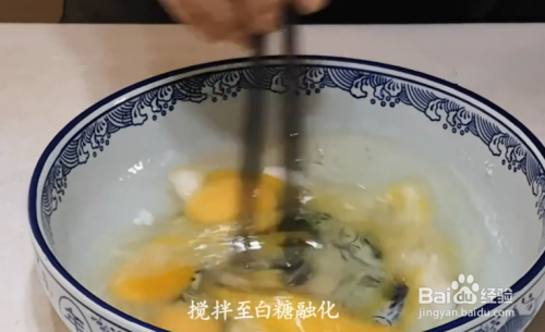 准备四个鸡蛋打入碗中,加食用油30克、适量的白糖搅拌至白糖融化;