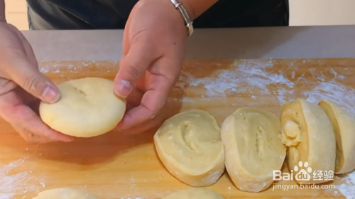 面发好后搓揉排气,再搓成大条,切成大小均匀的面剂,搓圆压扁,做好以后醒发15分钟;