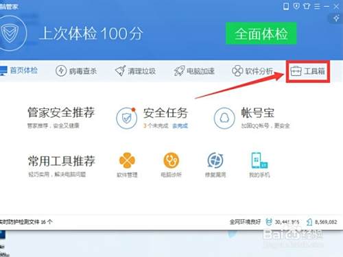 打开腾讯电脑管家,在首页的右边找到“工具箱”选项并点击进去。