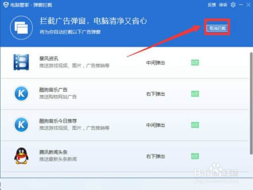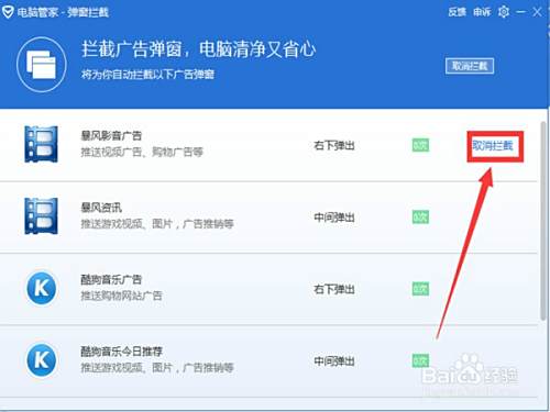 将鼠标置于想取消的广告的那一栏里,会出现“取消拦截”的选项,点击即可取消。