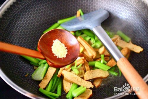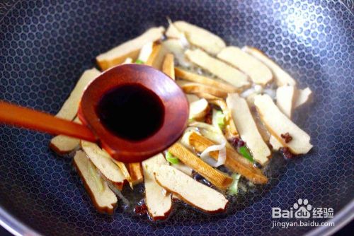 这个时候放入香干,小火慢慢煎至一会、加入生抽调色。