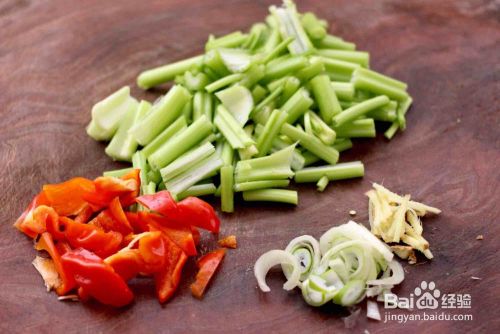 芹菜和红辣椒用刀切成条,葱姜切丝。