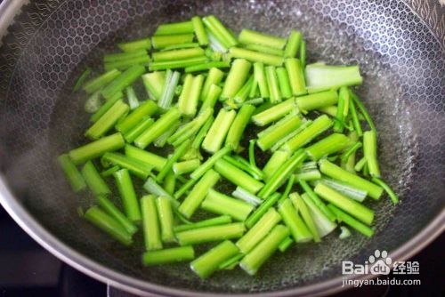 锅中倒入适量的清水烧开,加入少许盐和几滴食用油,把芹菜进行焯水,变色即可捞出。