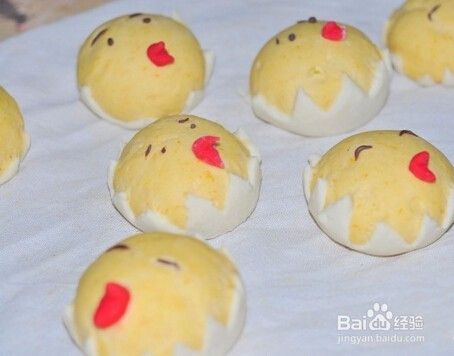 南瓜面团,揉成光滑的球。放在白面皮上。 包起来。做好以后,依次放入笼包上,有间隔的排列好。揪一小块可可面团,用剪刀修剪成眼睛,沾上一点水,粘在南瓜面团上。红色面团搓成小长条,粘在南瓜面团上做嘴巴,用剪刀剪开