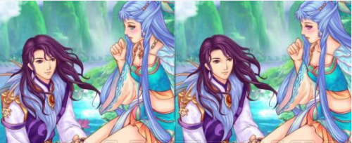 图片中7个不同的地方就是:①男子的刘海、②男子肩膀的徽记、③男子背部的刺(数量)、④女子的瞳色、⑤女子的项链、⑥女子的膝伤、⑦水中的荷花(屏幕中下方)。