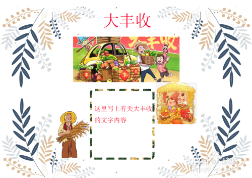 最后在手抄报的空白处画出彩色文字框,写上有关文字。一幅精美的农民丰收手抄报就制作完成了。