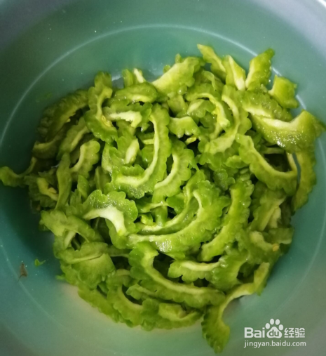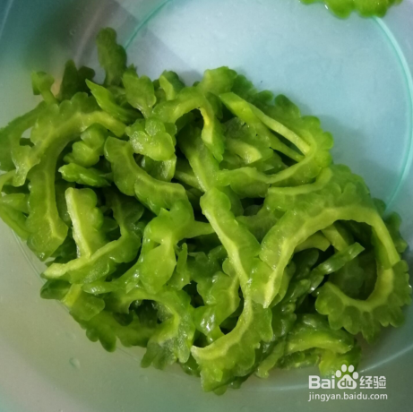 用清水淘洗两遍去除苦瓜的苦味,淘洗时可以用手捏一下,挤出苦瓜的苦汁;