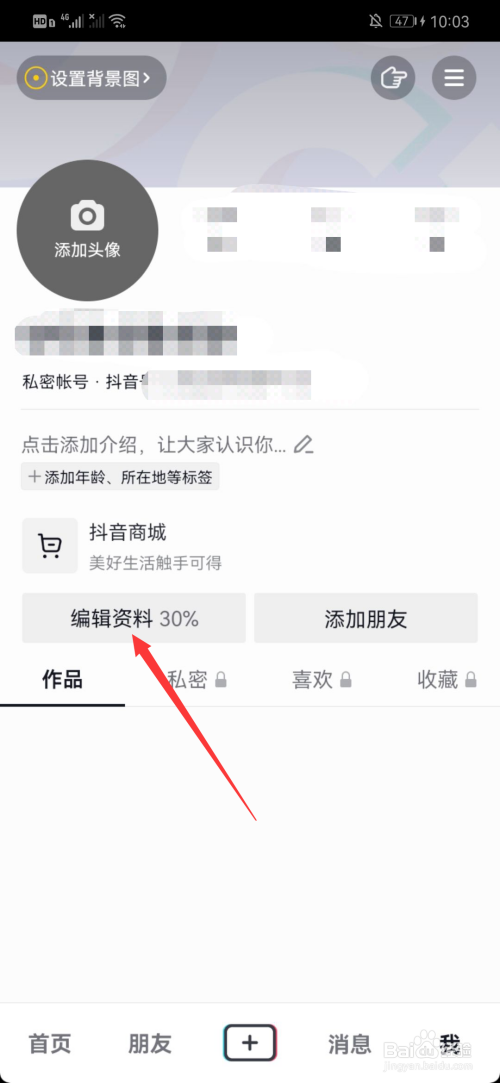 打开抖音应用程序,点击下方的我,点击编辑资料。