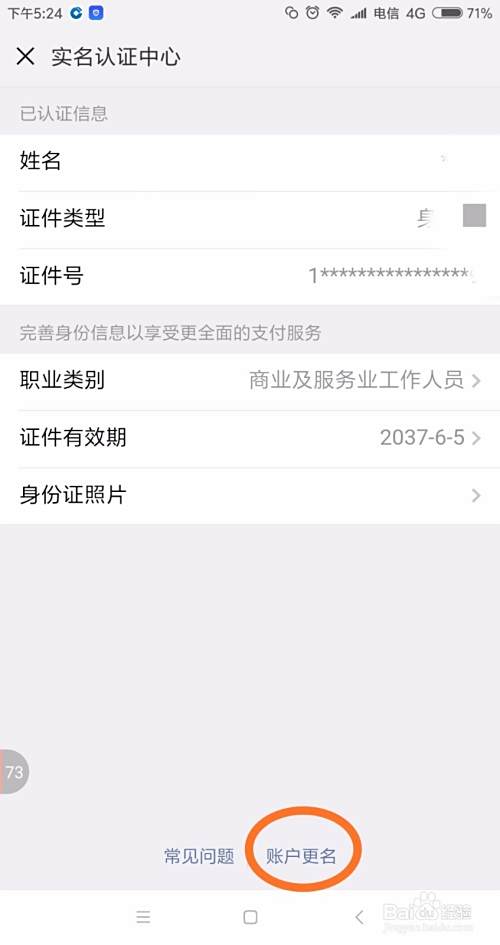 在实名认证中心页面,点击页面最下方的灰蓝色文字“账户更名”,进入“注销微信支付”页面