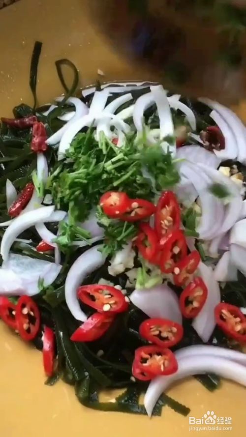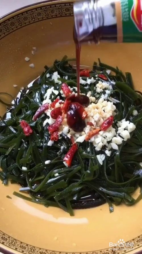 将海带丝切成合适的长短装入碗中,放入蒜末,干辣椒,烧热油浇在上面,激出香味