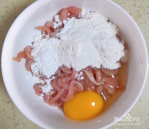 肉条中放入一个鸡蛋,放入淀粉和面粉,抓匀。
