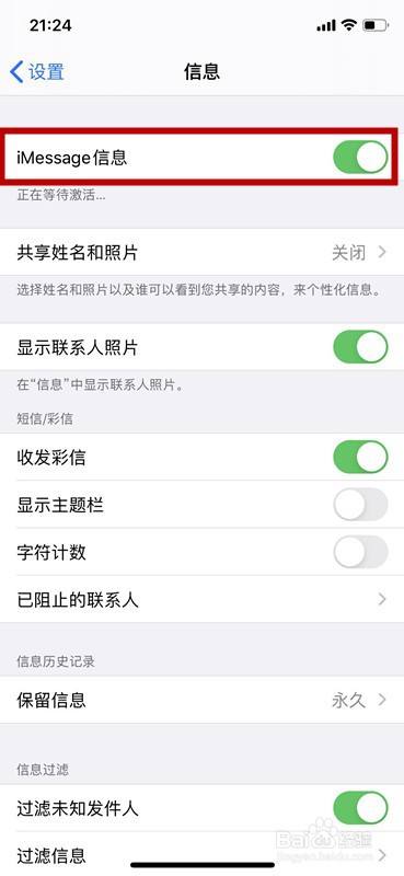 打开iMessage后,等上两分钟,再打开信息重新发送信息,这时就能成功发送短信了。