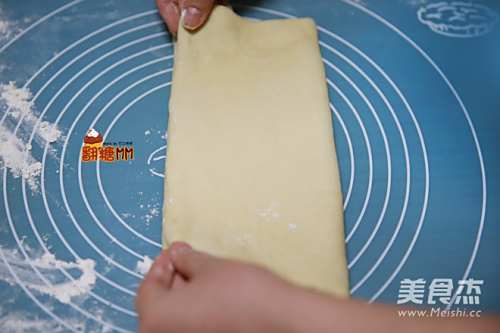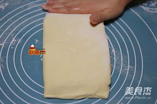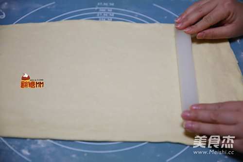 7将步骤3中松弛好的面团取出,在案板上放些面粉防粘。将面团擀成长方形面片,长度为黄油片3倍左右,宽度比黄油片宽一些。