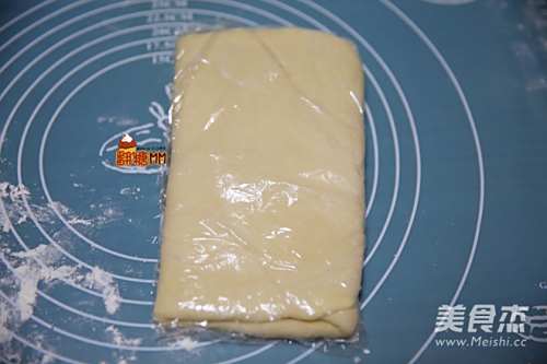 17取出松弛好的面团,进行第三次三折,完成三次三折后可颂面团就做好了,包上保鲜膜放入冰箱冷藏20分钟。