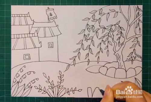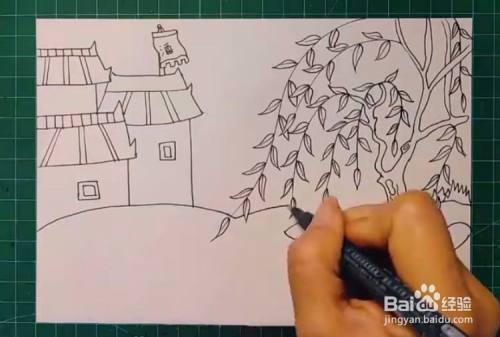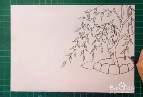 先画出一棵柳树的树干,再画出垂下来的柳条,再画出一片片柳叶,注意要画出叶子的纹路和树干的纹路,再画出树下的石头堆
