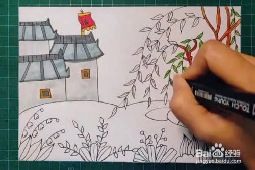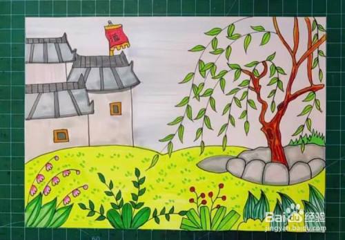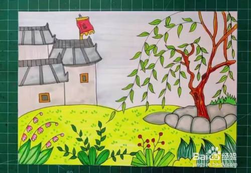 下面开始上色啦!先给柳树涂上褐色的树干,绿色的树叶,再给房屋涂上灰色,再给窗户涂上浅棕色,旗幡涂上红色和黄色