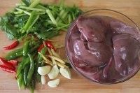 鸡肝洗净,芹菜切段,杭椒、米椒、姜切丝,大蒜拍碎。