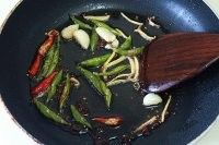 锅里倒油烧热,放入花椒、蒜瓣、姜丝、杭椒、米椒爆香。