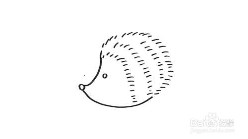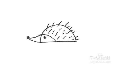 先画一个半圆形 做刺猬的身体,画一个尖尖的鼻子,接着画个刺猬的脸蛋,脸蛋上再画个小眼睛,在鼻尖处画上小圆鼻头,最后要给刺猬的身上画满刺,