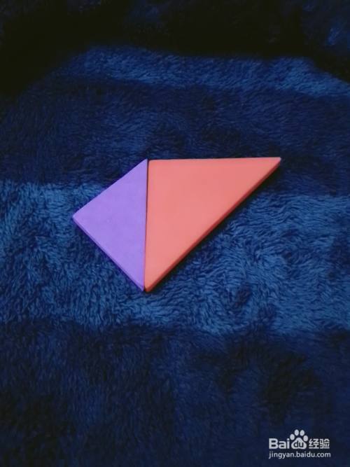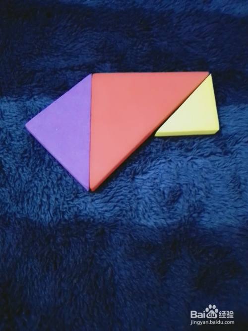 取出一个大号红色三角形板放在紫色板的右边,如图所示。