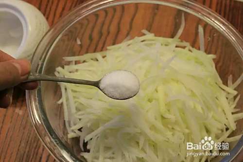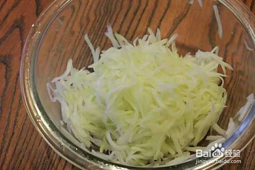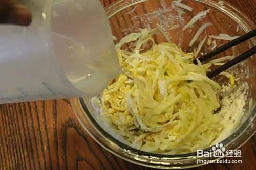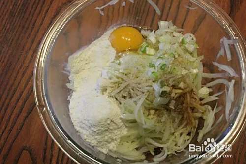 萝卜丝中加入一个鸡蛋,面粉,胡椒粉,葱花,生抽。如果你冲洗过萝卜丝,就再加一点盐。