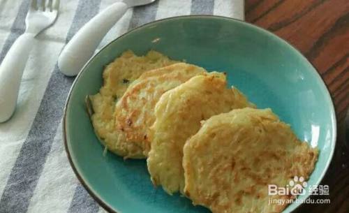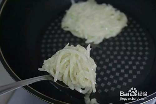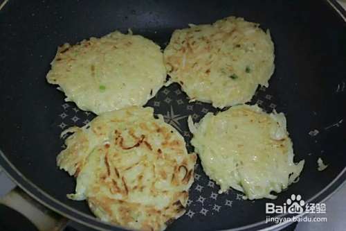 最后就是煎啦!不粘锅里放油,用勺子一勺一勺地放进萝卜丝,用勺子压一压,整形成圆饼,不圆也没什么关系。煎的时候用小火。