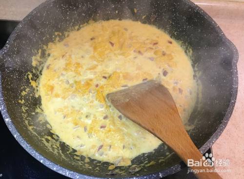 放入蒸熟的南瓜片,边炒边用铲子将其压成泥状。